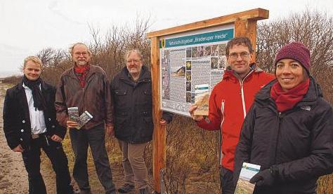 Die Schilder-Macher: Zimmermeister Christian Krause, Dr. Ekkehard Klatt von der Söl’ring Foriining, Schilder-Planer Holger Mordhorst, Dr. Thomas Holzhüter vom Landesamt und Margit Ludwig von der Naturschutzgemeinschaft (von links).