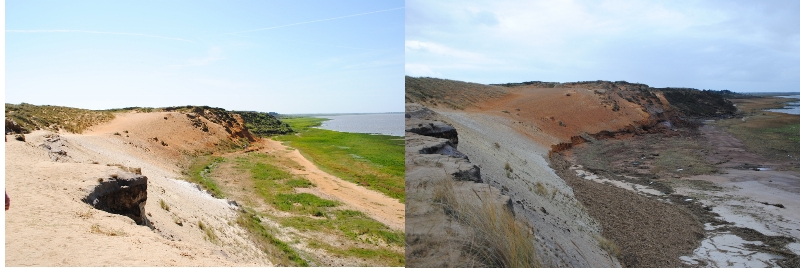 Der schwarze Glimmerton ist nun viel deutlicher zu sehen, da die Fluten ihn der Vegetation entledigten. Ebenfalls ein neues Äußeres zeigt nun der rote Limonitsandstein. Zahlreiche filigrane Strukturen, die durch verschiedene mineralische Verbindungen über Jahrmillionen entstanden, sind nun wieder an die Oberfläche getreten und für Jedermann sichtbar. Die Abbruchkante des weißen Kaolinsandes zeigt nochmals eindrucksvoll wie hoch das Wasser am höchsten Punkt der Sturmflut stand.