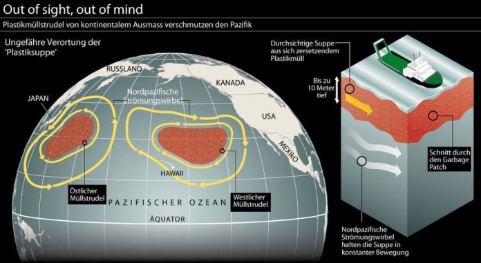 Plastikmüll lagert besonders in Form von Mikroplastik, aufgrund seiner vergrößerten Oberfläche, andere umweltschädliche Chemikalien (z.B. DDT, PCB) ein. Diese Chemikalien (POP’s -> persistant organic pollutants) umfassen krebserregende, nerven- sowie hormonschädigende Gifte und gelangen mit dem Mikroplastik in die Nahrungskette. Durch den Konsum von Fisch, Krebstieren, Muscheln, Algen und anderen Meeresbewohnern erreichen sie sogar den Menschen. Aufgrund ihrer Fettlöslichkeit reichern sie sich besonders in der Fettschicht des jeweiligen Organismus an. Das Problem ist mittlerweile so groß geworden, dass es selbst vom Weltall aus sichtbar ist. Der sogenannte „Great Pacific Garbage Patch“ wird auch als siebter Kontinent bezeichnet. Es handelt sich hierbei um einen Müllstrudel, der die Größe Mitteleuropas und eine Dicke von bis zu 10 m umfasst. Durch die Meeresströmungen konzentriert sich Plastik einer gewissen Größe unter anderem zwischen Hawaii und Japan. Aufgeteilt wird der Müllstrudel in einen östlichen und einen westlichen Teil. Hauptfunde sind Zigarettenfilter und Plastiktüten.
